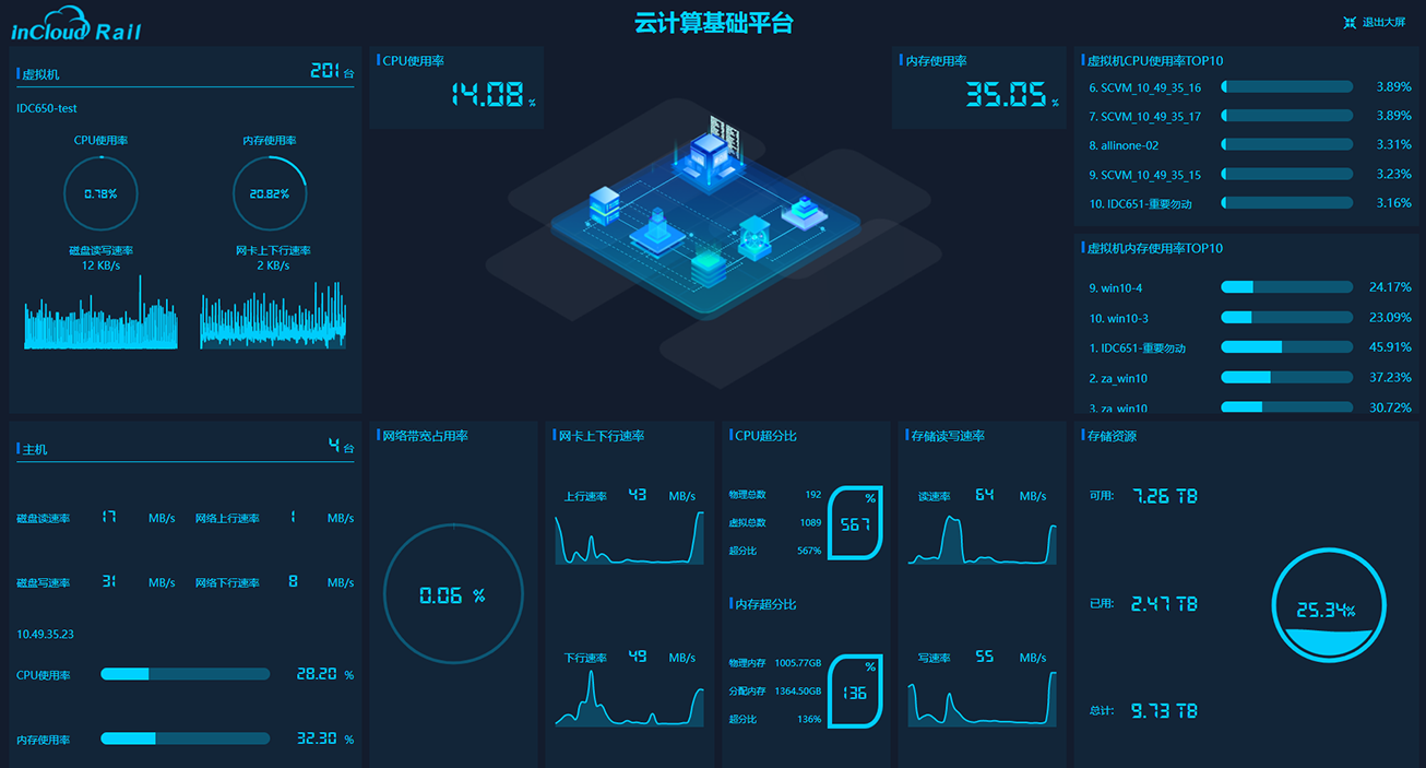 采用自主研发、基于 KVM 深度定制的计算虚拟化软件 InCloud Sphere,支持资源预留、热添加、GPU 直通、vGPU、USB Over IP、 DRS、DRX、裸机管理、虚拟录影机、磁盘双活等多种高级特性 |