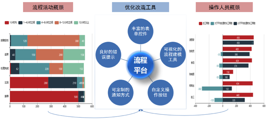 平台给予丰富的流程效能分析图表,实时呈现业务流程问题,企业可顺利获得平台给予的流程工具快速进行业务流程优化改造,敏捷应对市场和业务变化。平台给予的主要工具包括